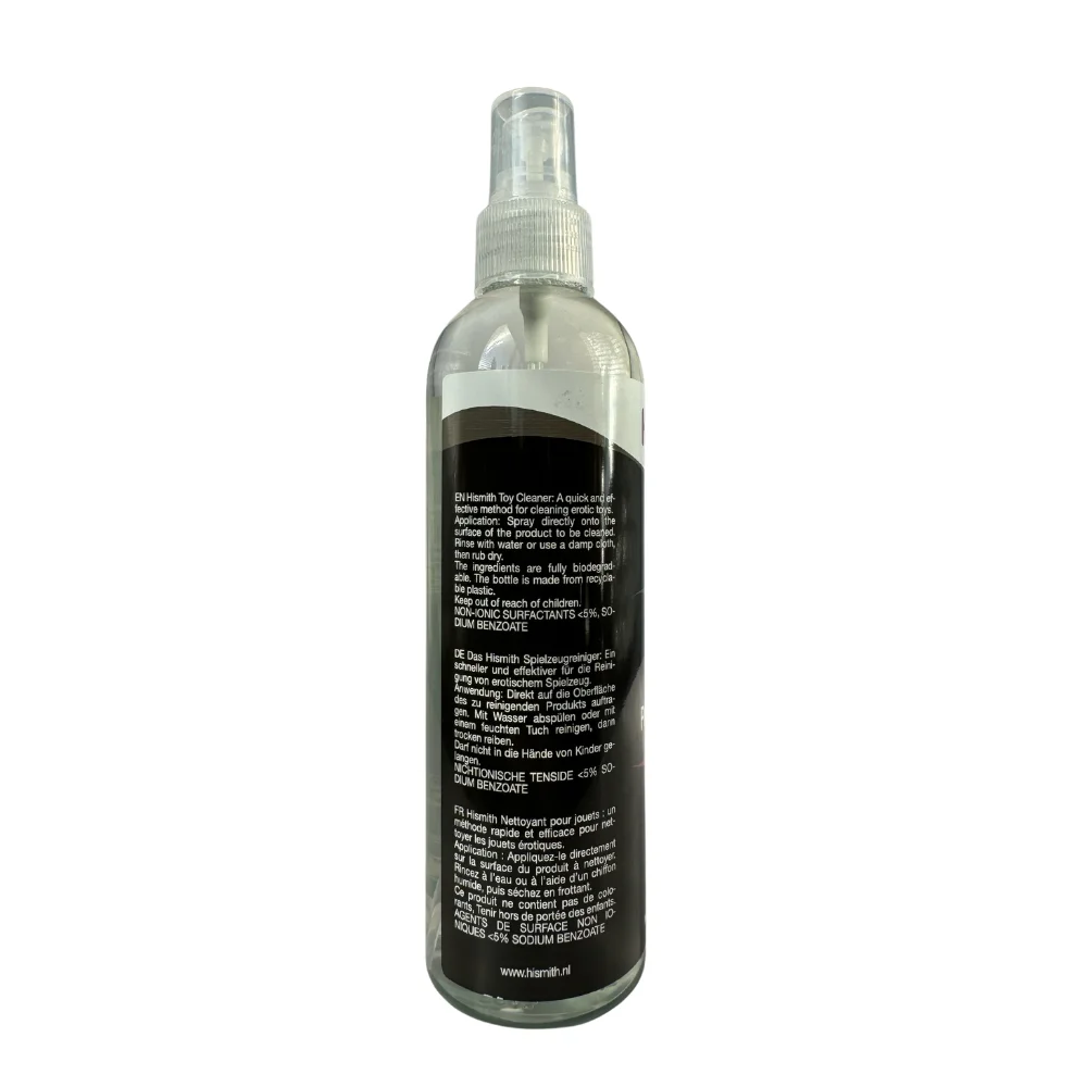 ¡No hay nada mejor que un juguete sexual limpio! Con este práctico limpiador de juguetes Hismith® podrás garantizar la higiene de tus juguetes sexuales. Gracias a su fórmula suave y no irritante, podrás limpiar con seguridad cada juguete sin dañarlo. El spray antibacteriano es a base de agua y, por lo tanto, no daña el látex, el caucho ni la silicona. Este producto se presenta en una botella de 230 ml